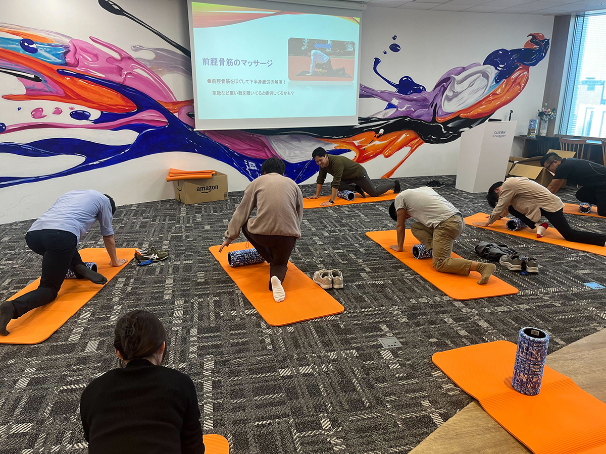 健康支援施策としては、「食事」に関して、栄養バランスを考慮したサポート(朝食パン、有機野菜を使用したスムージーやスープの提供、食生活セミナーの開催など)を行っています。また、定期的なエクササイズイベント(マインドフルネスヨガ、セルフストレッチ、ランニングなど)を開催し、「運動」に関連するさまざまな取り組みを実施しています。